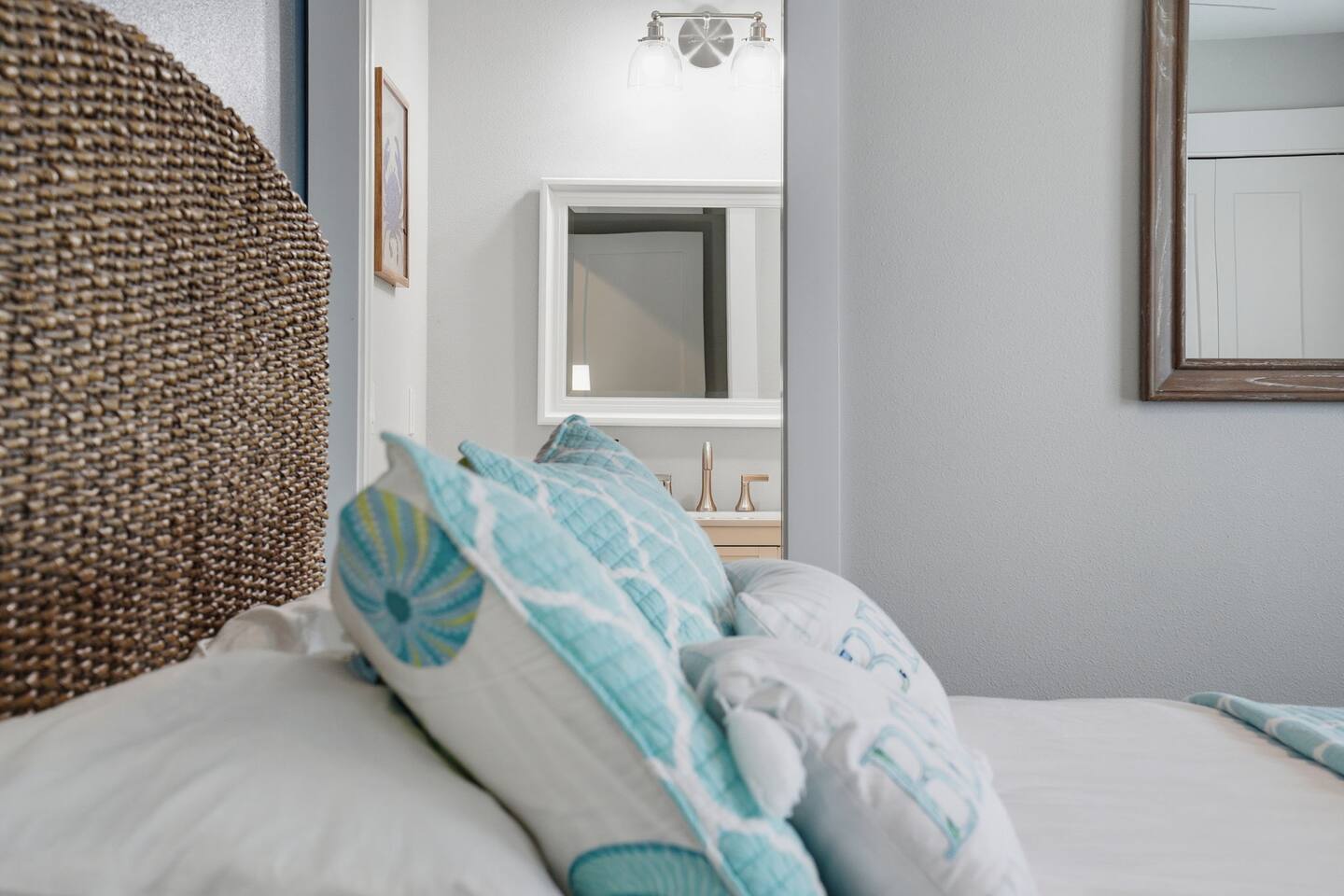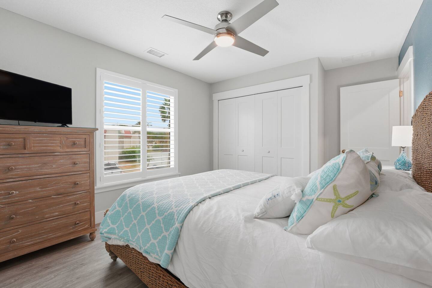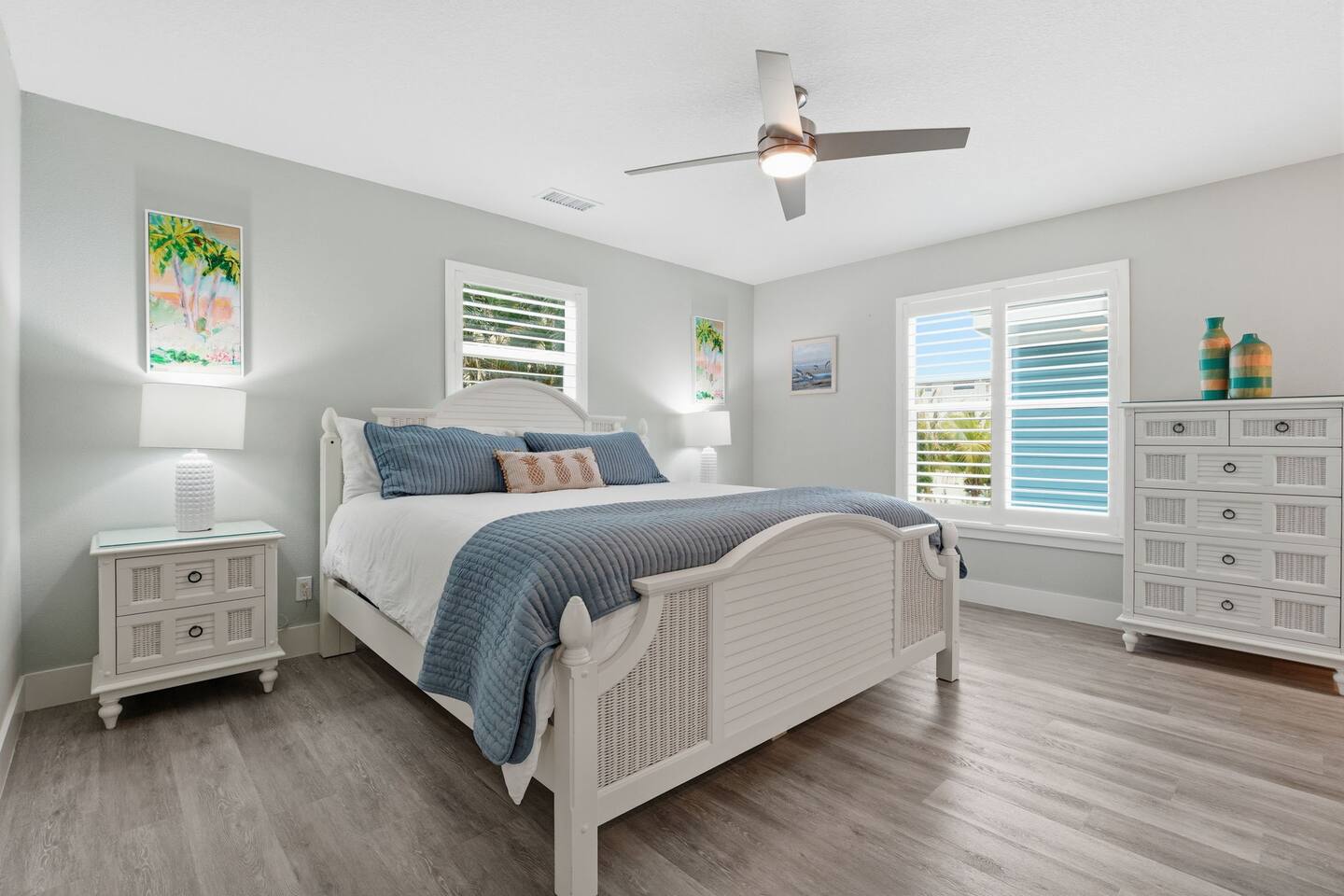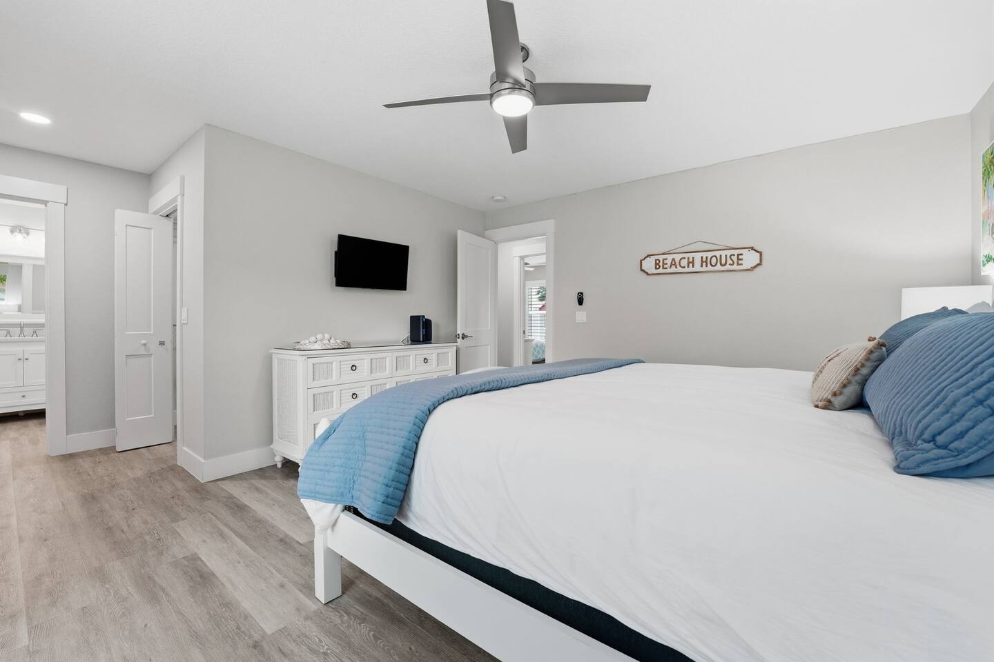 Island Oasis offers eight spacious bedrooms and five full bathrooms, ensuring everyone in your group has plenty of room to relax and unwind. Each bedroom is professionally decorated with coastal touches, luxe bedding, and Smart TVs for streaming your favorite shows.