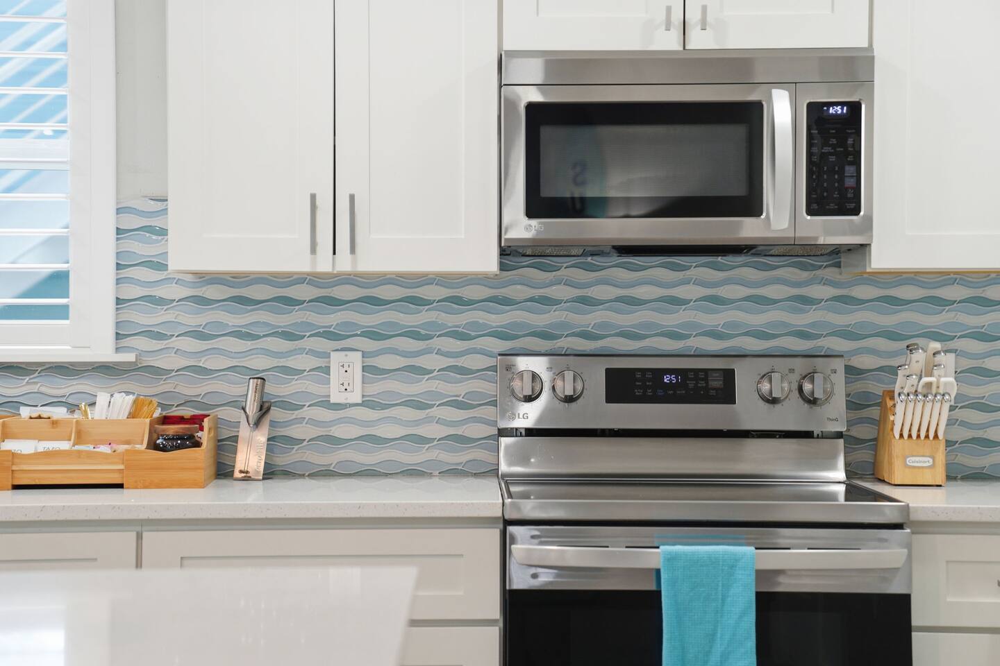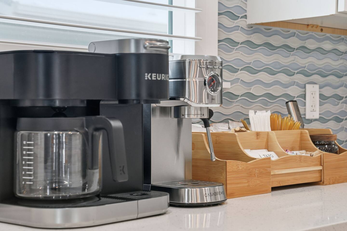 Coffee lovers will adore the fully stocked coffee, and tea bar, complete with coffee pods, sugar, and tea selections. Whether you prefer a morning cappuccino on the rooftop deck or an afternoon iced tea by the pool, you’ll have everything you need for your daily ritual.