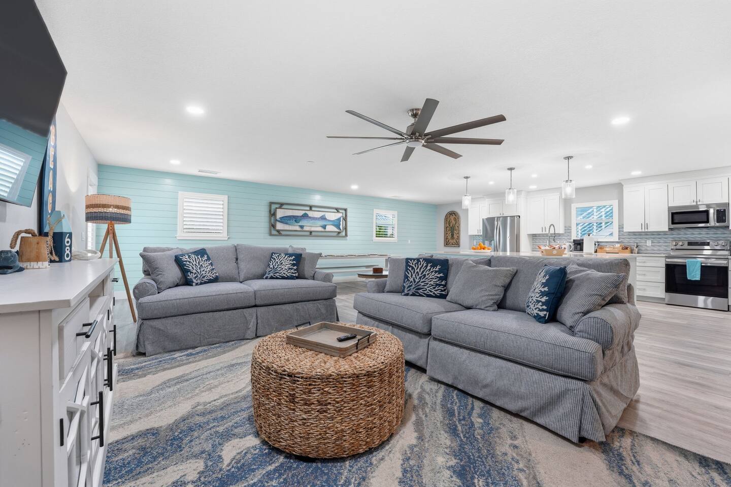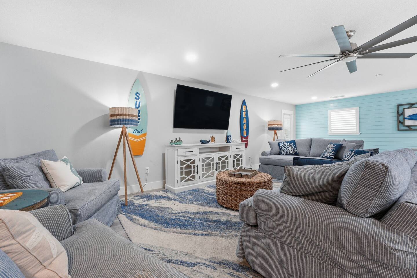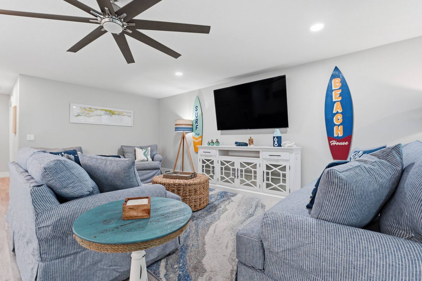 The main living room features two sofas, two large chairs, Smart TV. This is the perfect spot to unwind after a day on the sand or enjoy a family movie night.