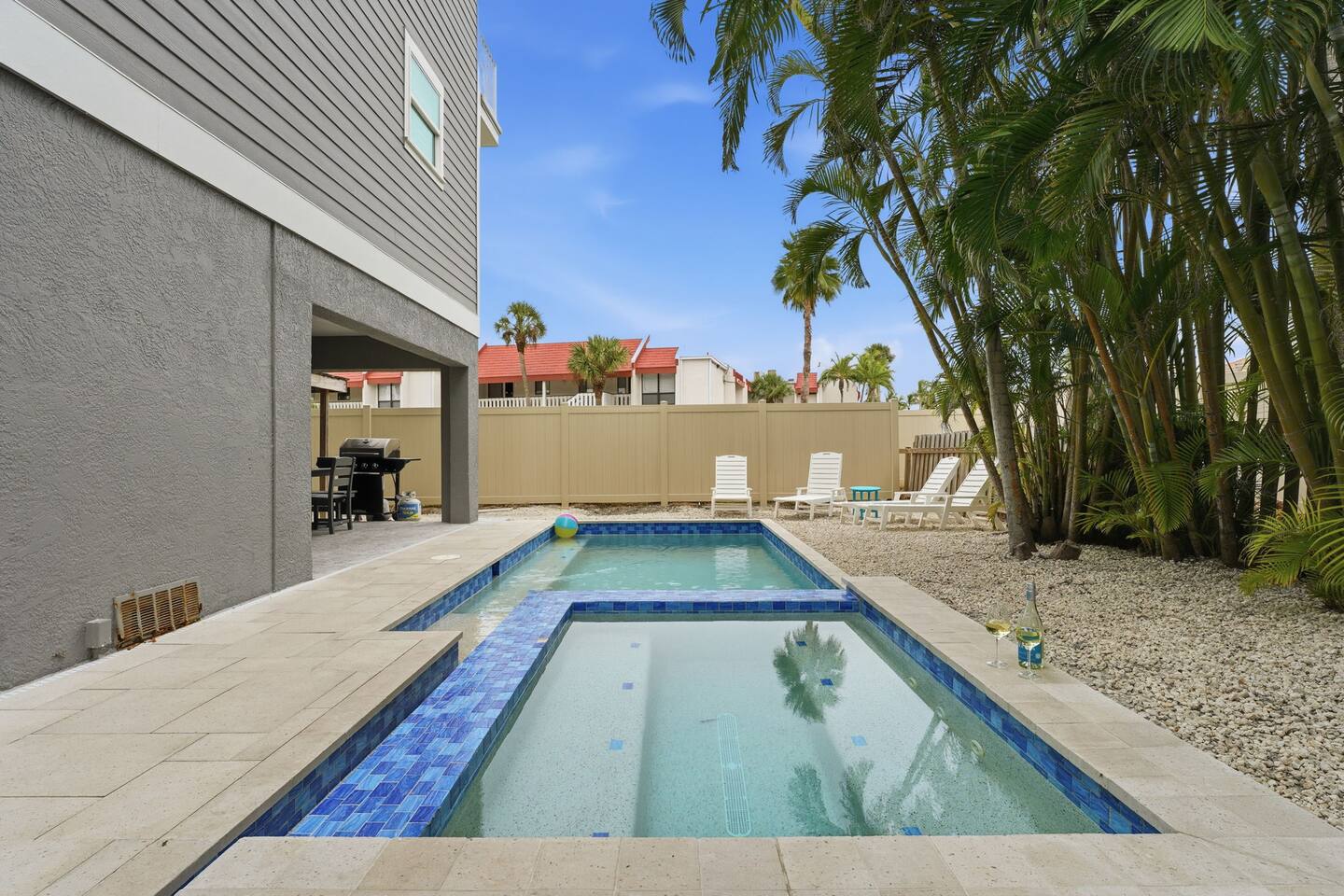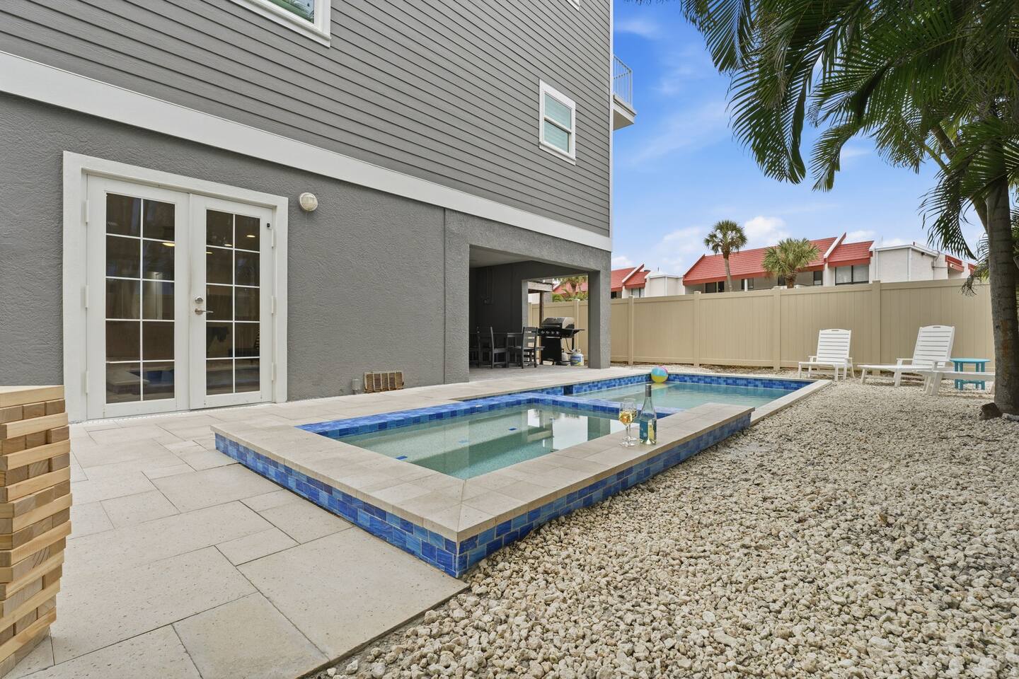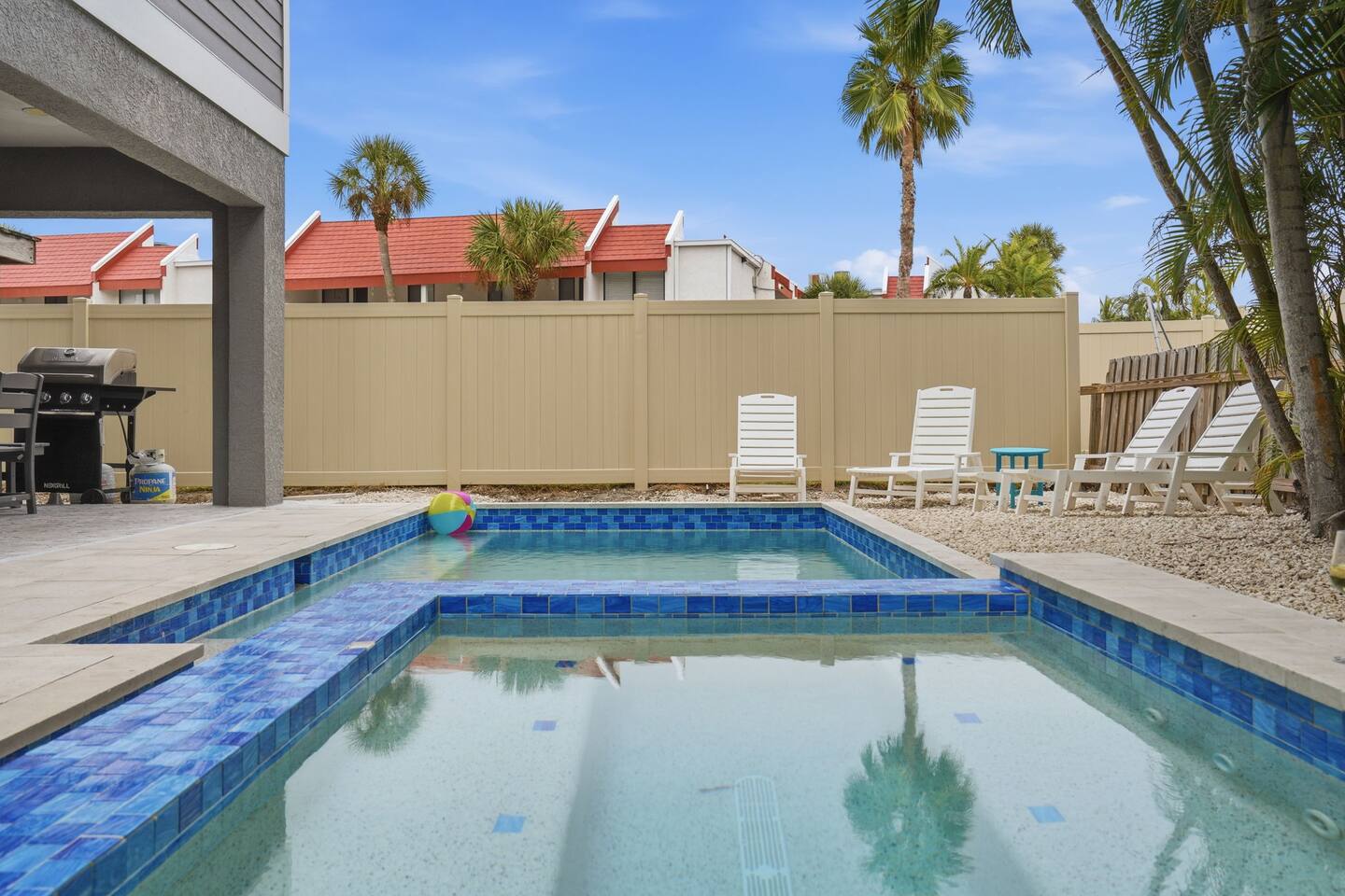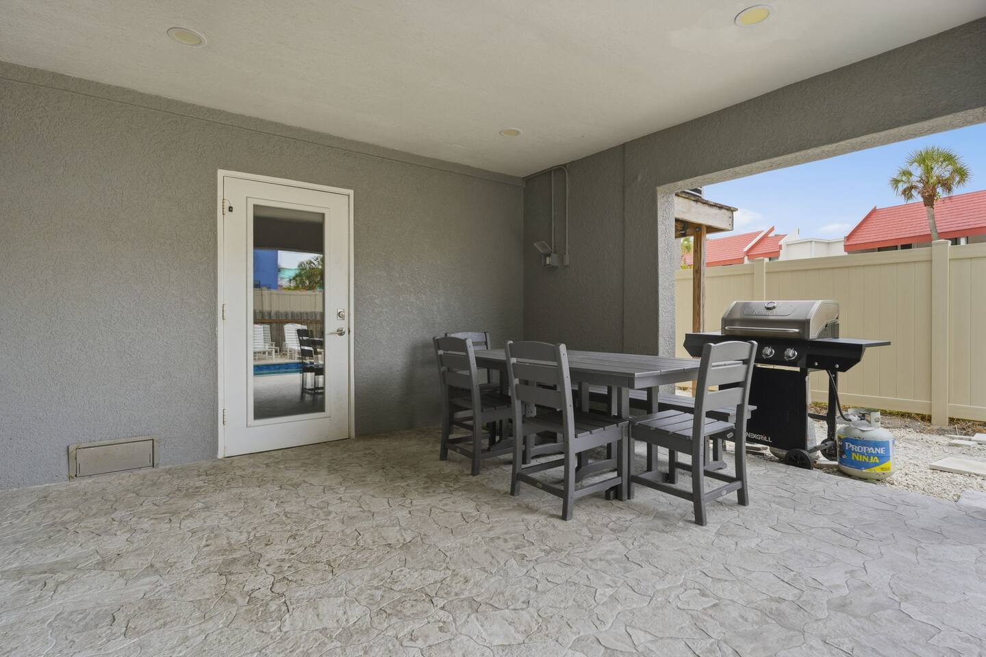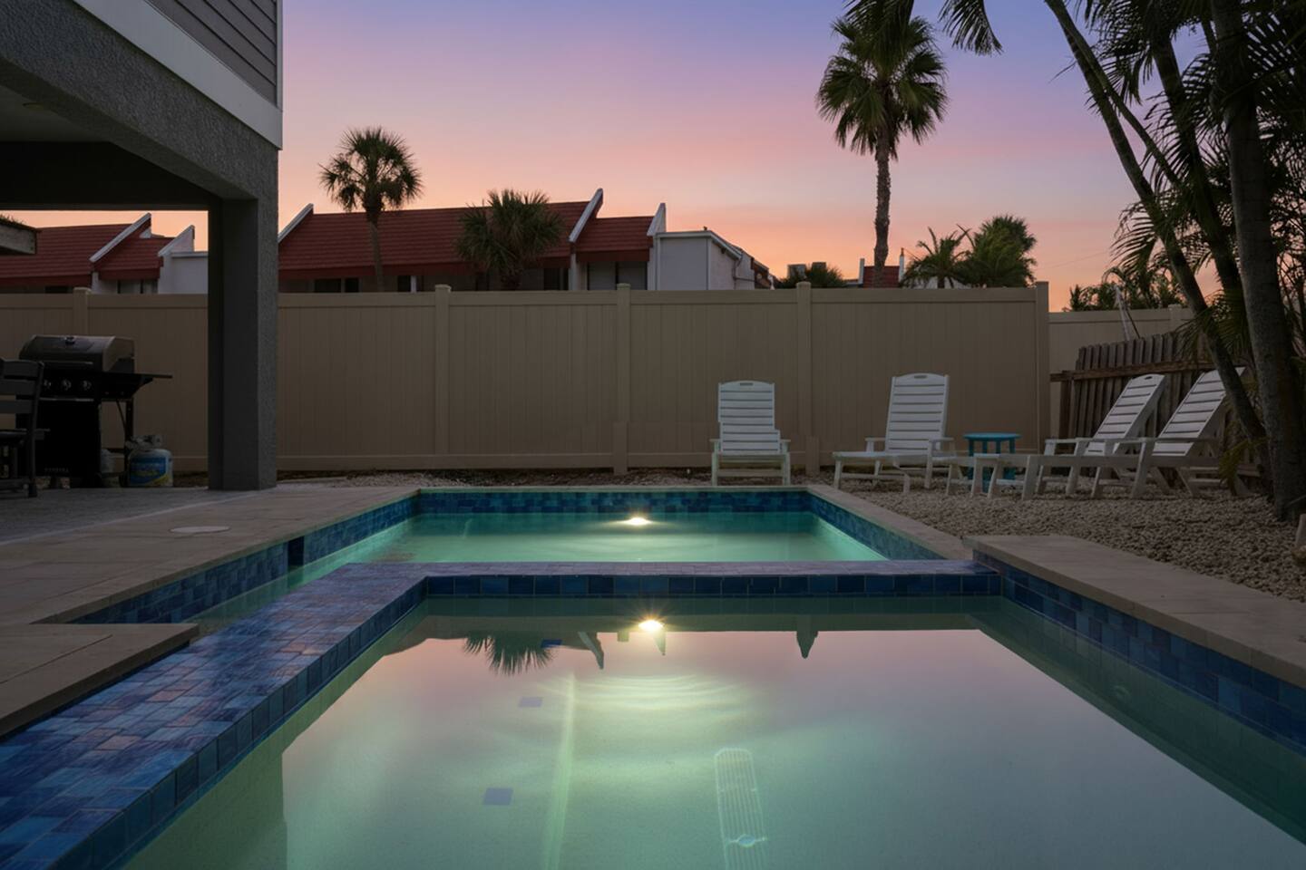 The pool deck offers shaded seating, lounge chairs, a gas grill, and a dining table for al fresco meals.